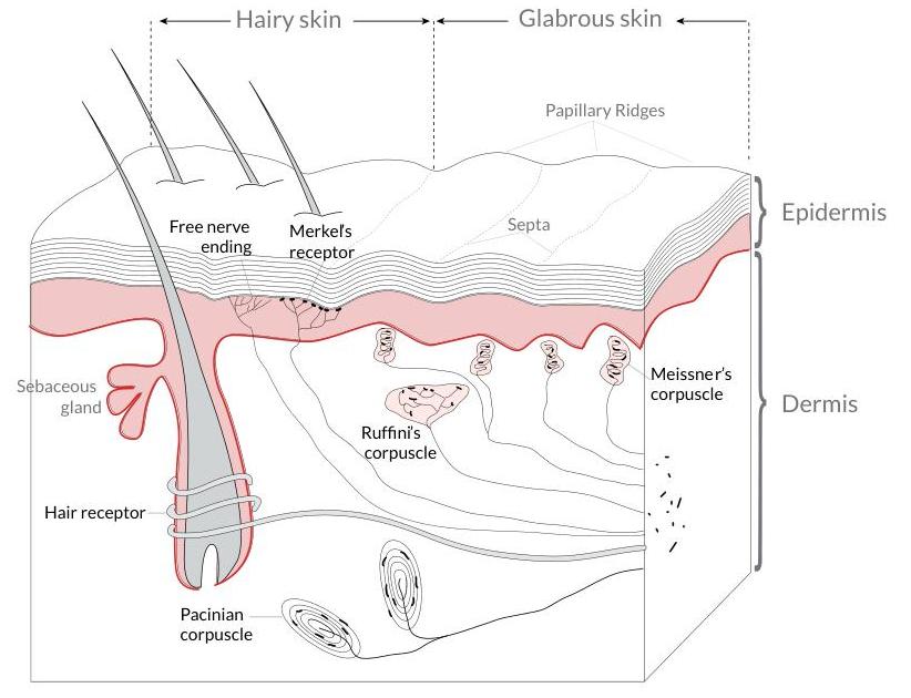 Our somatosensory system consists of sensors in the skin and sensors in our muscles, tendons, and joints. The receptors in the skin, t